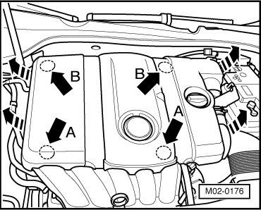 - First place engine cover on to rear mounting points - arrows B -, then on to front mounting points - arrows A -.