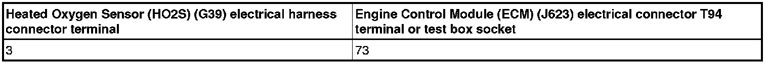 - Using a multimeter, check the Heated Oxygen Sensor (HO2S) (G39) electrical harness connector terminal 3 to the Engine Control Module (ECM) (J623) electrical harness connector T94 terminal 73 for an open circuit. Refer to Wiring Diagrams for pin locations.