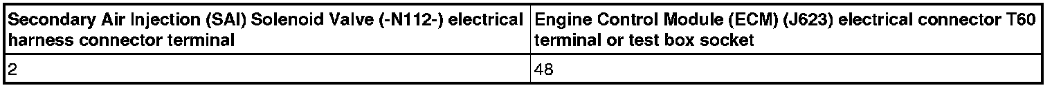 - Using a multimeter, check the Secondary Air Injection (SAI) Solenoid Valve (-N112-) electrical harness connector terminal 2 to the Engine Control Module (ECM) (J623) electrical harness connector T60 for an open circuit.