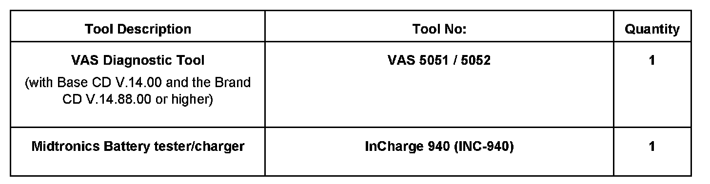 Battery MUST have minimum no-load charge of 12.5 V (failure to maintain voltage during update process can lead to ECM failure) (use a Volkswagen approved Midtronics/InCharge 940 (INC-940) tester/charger to maintain battery voltage).
