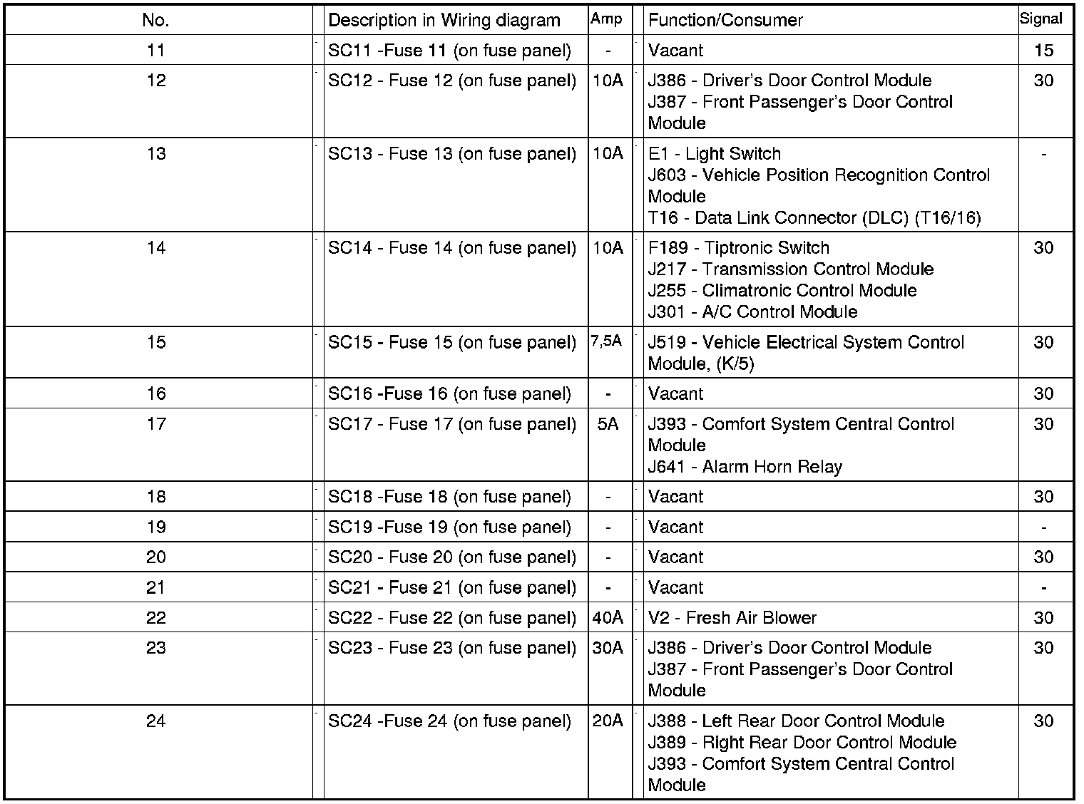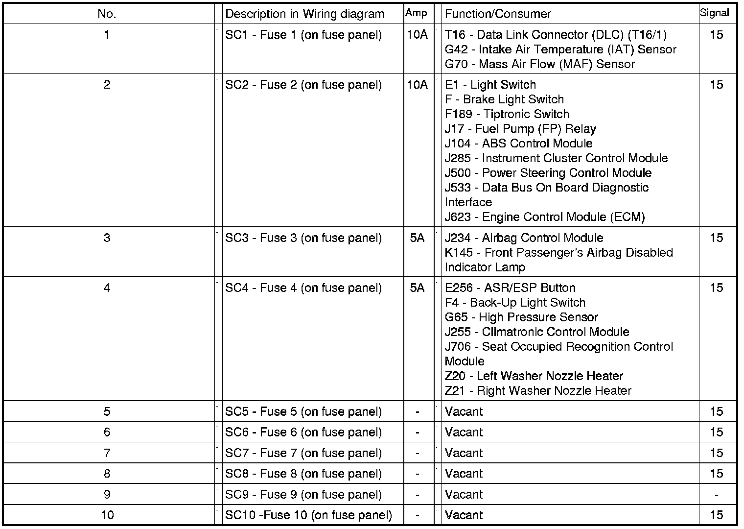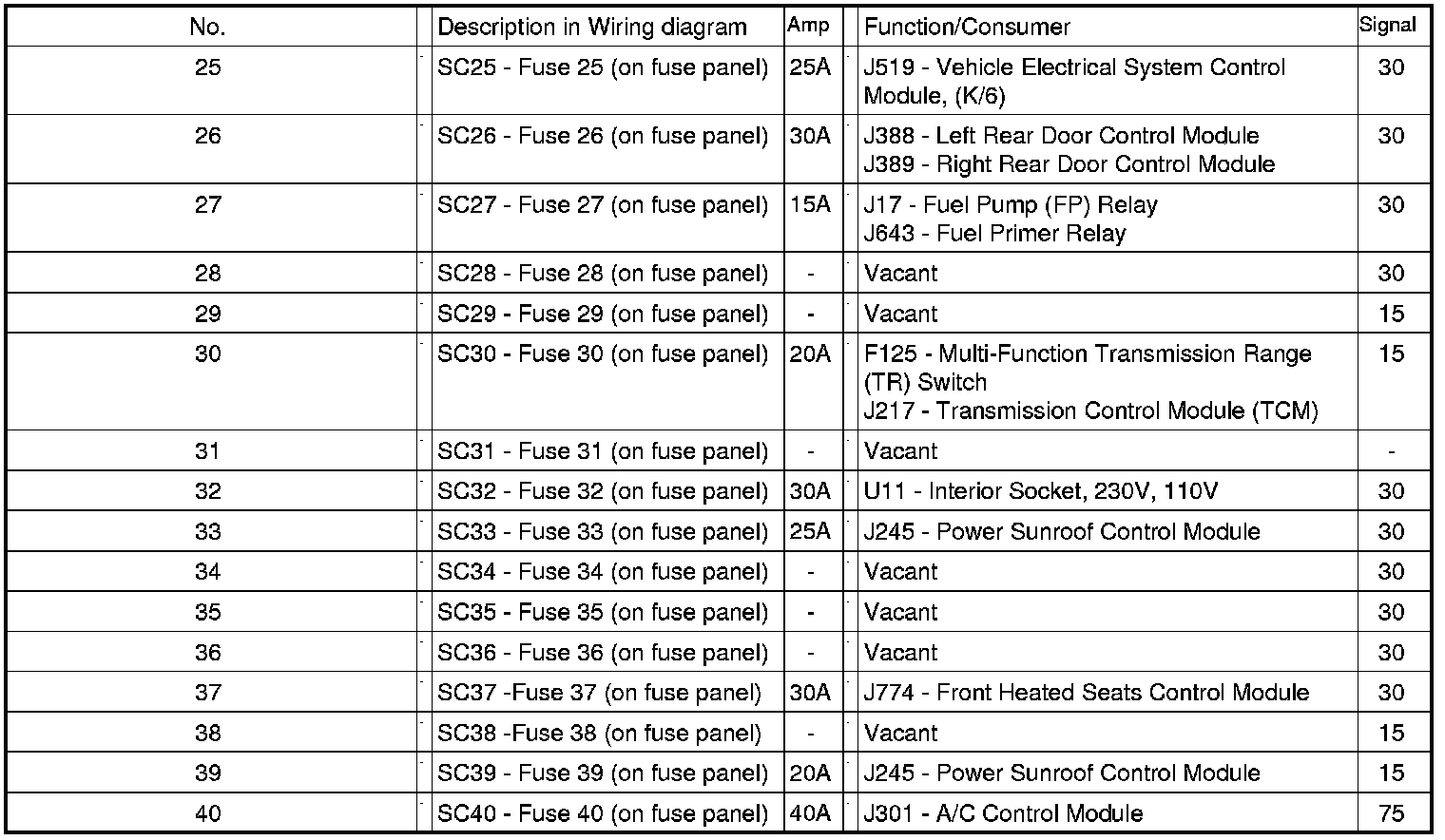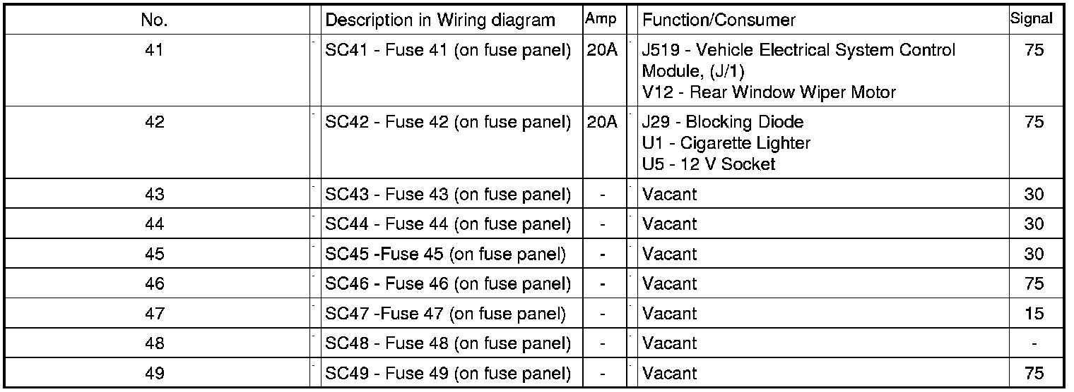 Fuse Arrangements "SC" On Fuse Panel, In Instrument Panel, Left