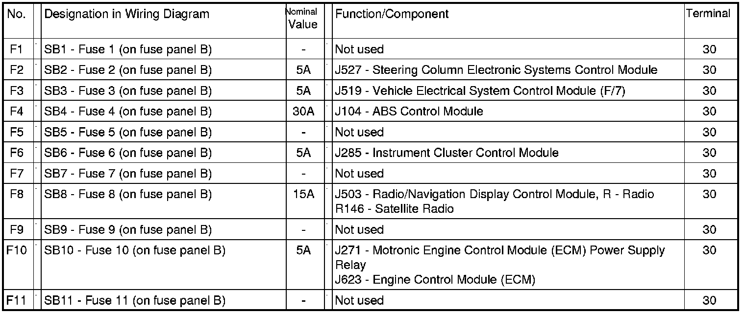Overview of fuse arrangements (SB) on Electronics Box, in engine compartment, left, from January 2008