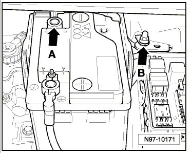 (12) - Ground Connection, in engine compartment, left => -Arrow B-