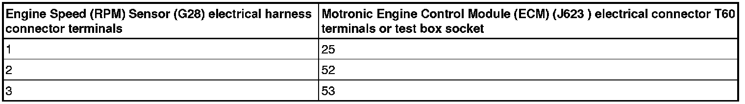 - Using a multimeter, check the Engine Speed (RPM) Sensor (G28) terminals 1 to 3 for resistance.