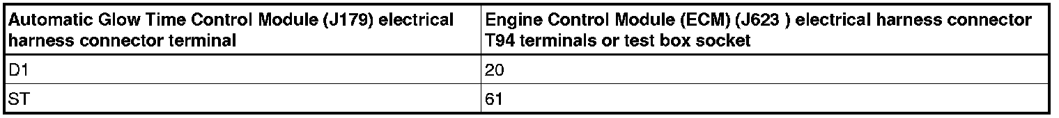 - Using a multimeter, check the Automatic Glow Time Control Module (J179) electrical harness connector to the Engine Control Module (ECM) (J623) electrical harness T60 connector for resistance.