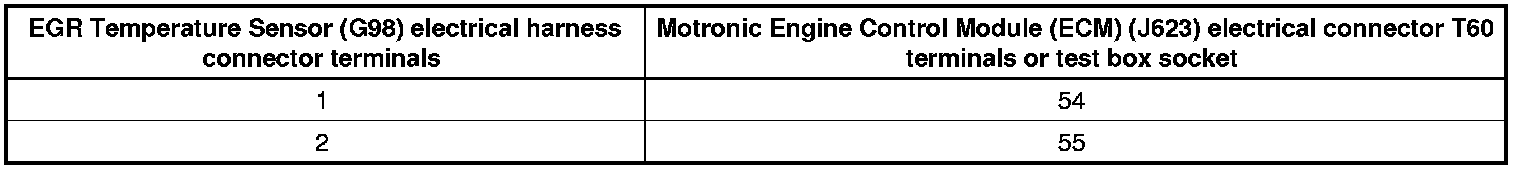 - Using a multimeter, check the EGR Temperature Sensor (G98) electrical harness connector terminals to the Motronic Engine Control Module (ECM) (J623) electrical harness connector T60 terminals for an open circuit according to the wiring diagram.