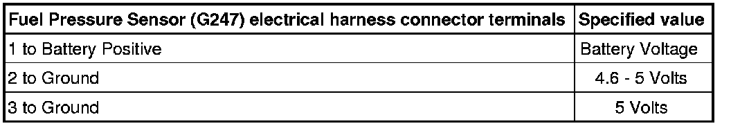 - Using a multimeter, check the Fuel Pressure Sensor (G247) view electrical harness connector terminals for voltage.