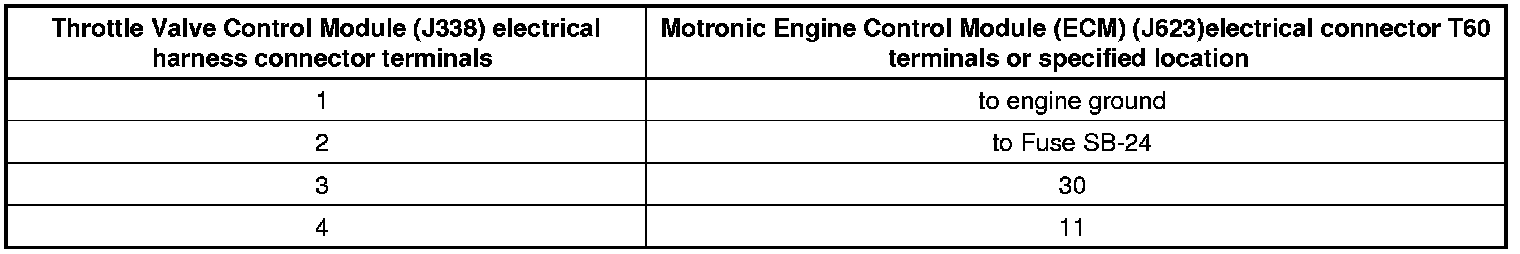- Using a multimeter, measure the voltage between terminal 1 and 4 of the Throttle Valve Control Module (J338) electrical harness connector.