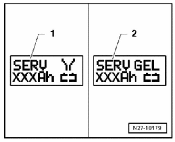 The symbol - 1 - for "service charging of wet batteries" or the symbol - 2 - for "service charging of Gel/Absorbent Glass Mat (AGM) batteries" is indicated in the display.