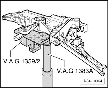 - Guide engine and transmission jack (V.A.G 1383 A) under transmission and support transmission. Do not lift up.