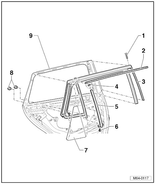 • Removing and installing, refer to --> [ Window Guide Trim Molding ] Rear Door Windows, Wagon