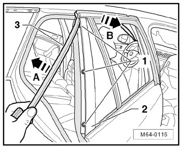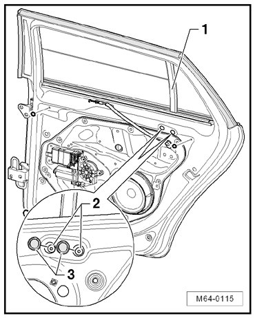 - Remove the center brace - 3 - from the clip - 2 - and the window guide - 1 -.