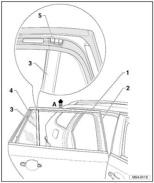- Remove the entire window guide - 1 - with the fixed door window - 4 - and center brace - 3 - upward in the direction of - arrow A - out of the door.
