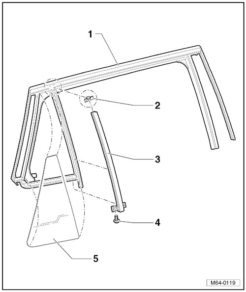 - Disengage the window guide - 1 - with the fixed door window - 2 - on inside and outside all around from the window frame - 4 -.