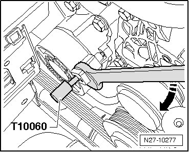 - Slacken ribbed belt by pivoting tensioner with an SW 16 open end wrench in - direction of arrow - and secure tensioner using (T10060 A).