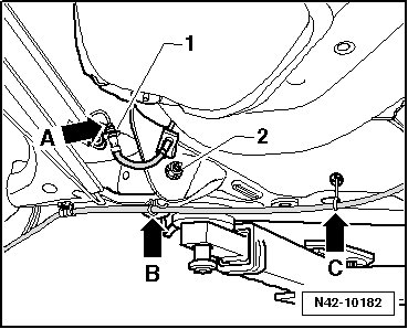 - Remove parking brake cable out of holders - arrow B - and - arrow C -.