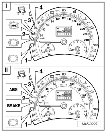 If ABS warning lamp (K47) - 1 - and brake system warning lamp (K118) - 2 - only light up after 10 km/h or 2000 RPM are reached and 3 warning tones are heard, ABS and EBD have ceased functioning.