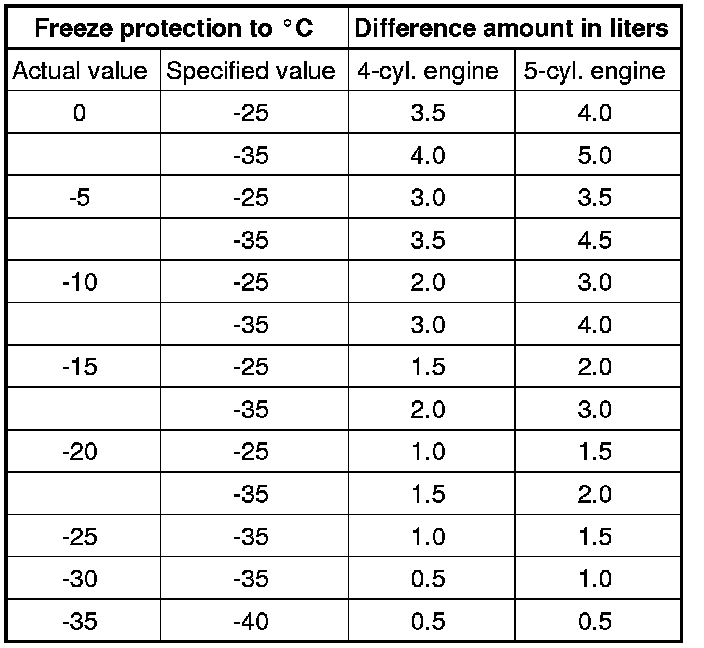 - If freeze protection is insufficient, drain off required quantity shown in freeze protection table and add coolant additive -G 12- which corresponds to TL VW 774 F.