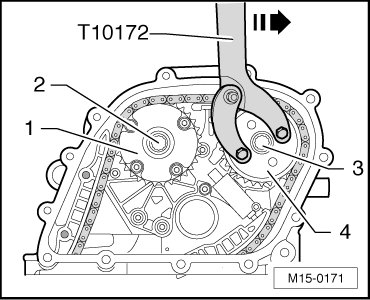 - Install the modified (T10172) to the exhaust camshaft sprocket - 4 -.