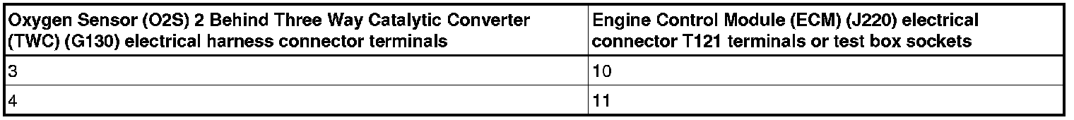 - Using a multimeter, check the Oxygen Sensor (O2S) 2 Behind Three Way Catalytic Converter (TWC) (G130) electrical harness connector terminals to the Engine Control Module (ECM) ( J220) electrical harness connector T121 terminals for resistance.