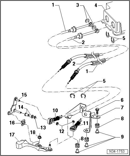 Do not interchange! Cable locking mechanisms for selector lever cable on linkage lever and on transmission shift lever are different => [ Allocation of Cable Retainers ]