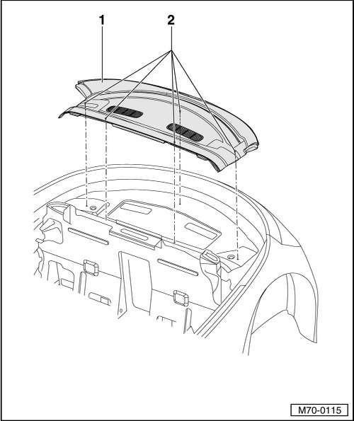 - Unclip rear shelf - 1 -, press clips - 2 - out of the luggage compartment and remove in an upward direction if necessary.