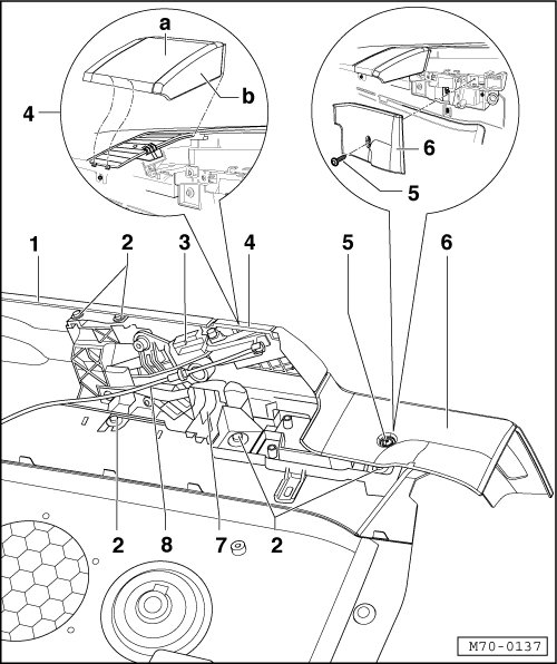 • To remove and install the lid module, screw the side trim bolts out/in. Also observe the information regarding the side trim (convertible) during removal and installation=> [ Side Trim ] Pillar and Side Trims, Convertible.