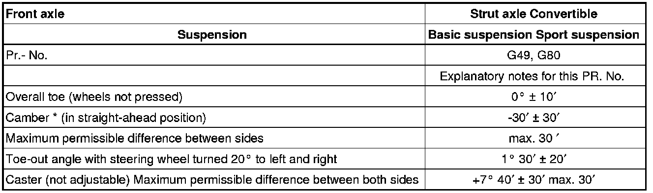 * Camber is not adjustable. Only slight corrections are possible by moving the subframe. Adjustment range approximately 10' to 15'.