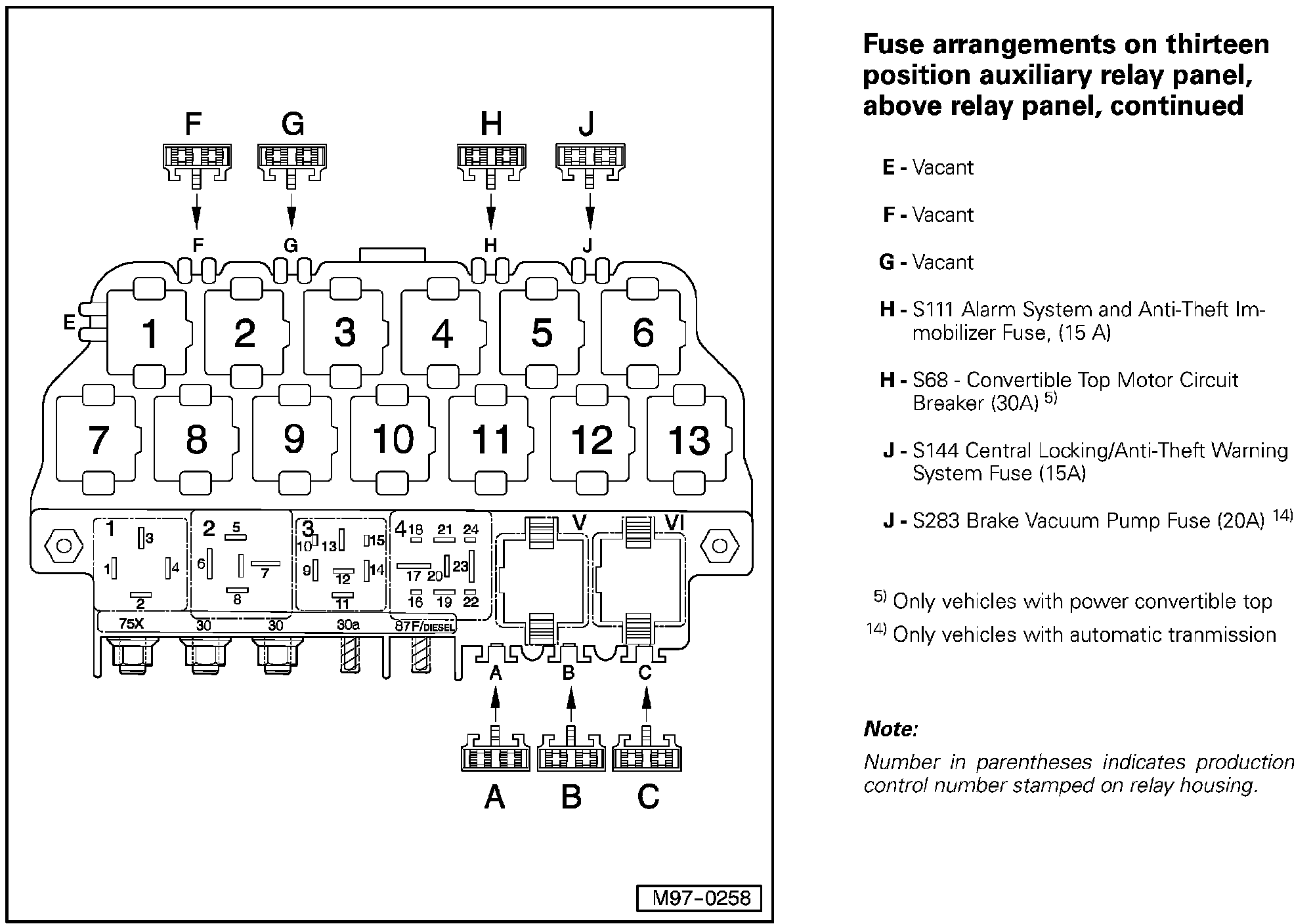 Fuse Arrangements on Thirteen Position Auxiliary Relay Panel, Above Relay Panel, From July 2005