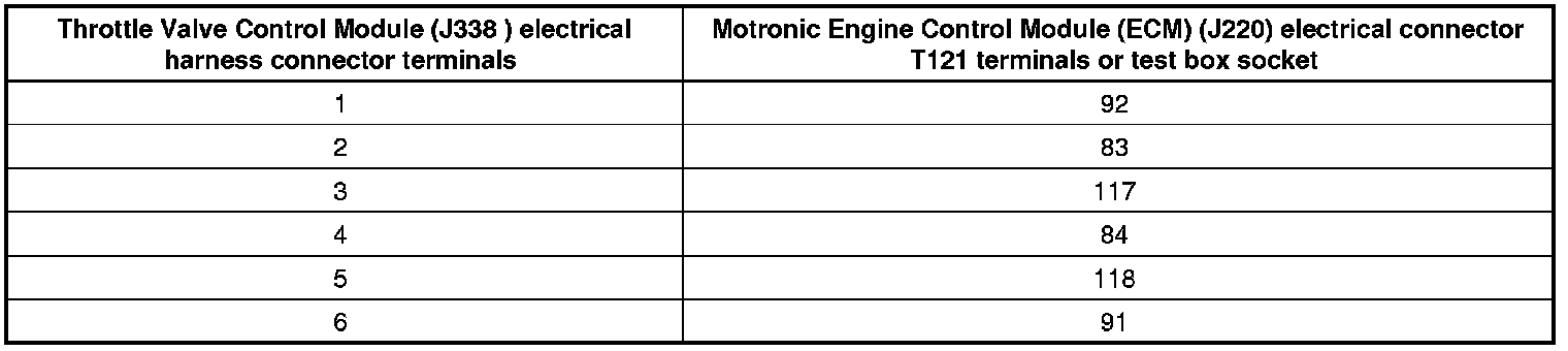 - Using a multimeter, check the Throttle Valve Control Module (J338) electrical harness connector terminals to the Motronic Engine Control Module (ECM) (J220) electrical harness connector T121 terminals for an open circuit according to the wiring diagram.