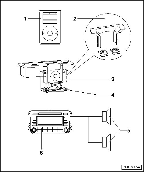 • Connector overview => [ iPod Mount, Multi-Pin Connector Assignments ] Ipod Mount, Multi-Pin Connector Assignments.