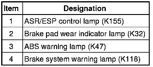 • If the ASR/ESP control lamp (K155) - 1 - did not light up during self-test, the following malfunction is present: