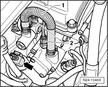 - Disconnect the connectors - arrows - and remove the low pressure hose - 1 - and high pressure line - 2 -. When doing this, counter hold the connection on the high pressure pump using a wrench.