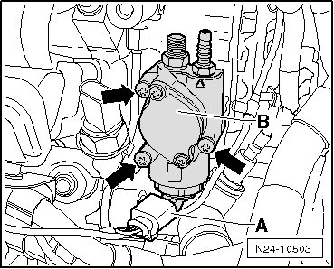 - Disconnect the connector - A -, remove the bolts - arrows - and remove the high pressure pump - B - from the engine.