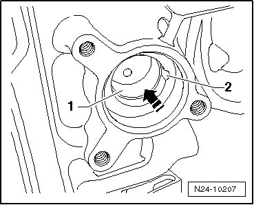 - Rotate the engine at the vibration damper slowly in engine rotation direction. When doing this, press the plunger in the - direction of the arrow - until it reaches the deepest point in the cylinder head.