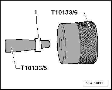 - Place the new seal - 1 - onto the (T10133/5). Slide the seal onto the (T10133/5) as far as it will go using (T10133/6) (the knurl faces toward the seal - 1 -).
