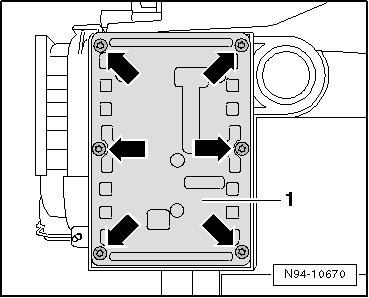 - Remove mounting bolts - arrows - and pull High-intensity Gas Discharge Lamp Control Module - 1 - as far from headlamp as wire lengths allow.