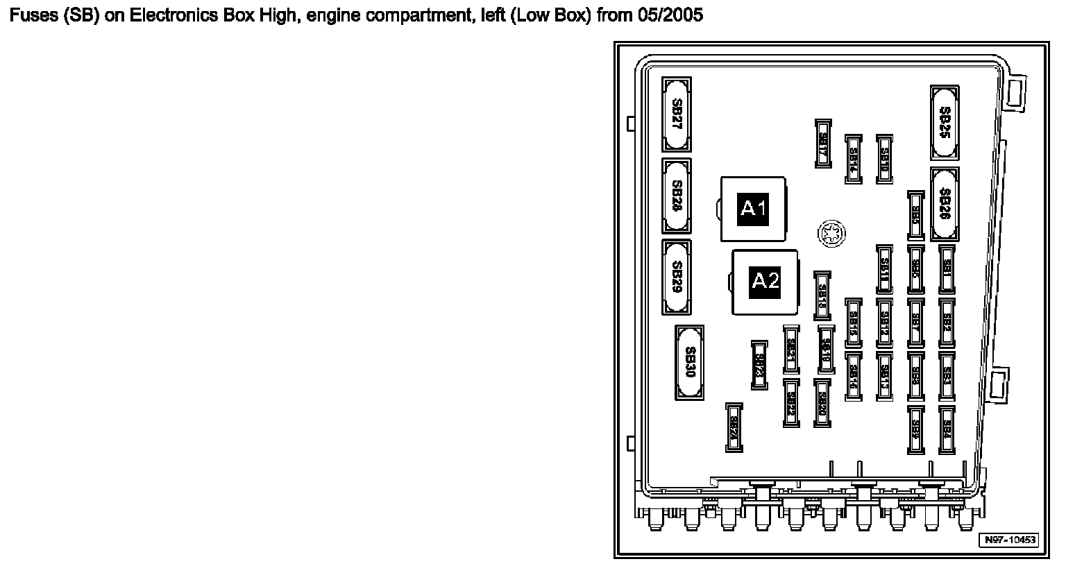 Fuses (SB) on Electronics Box High, Engine Compartment, Left (Low Box)