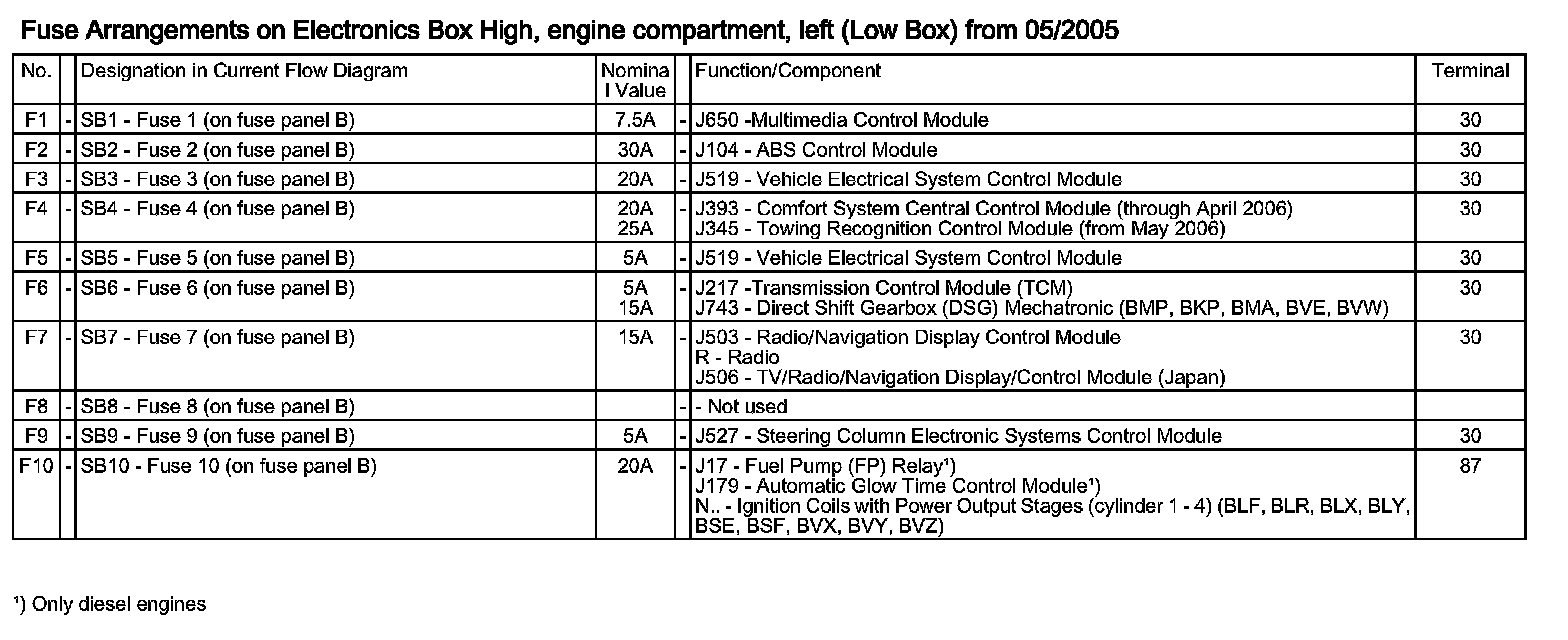 Fuse Arrangements On Electronics Box High, Engine Compartment, Left (Low Box) Part 1: