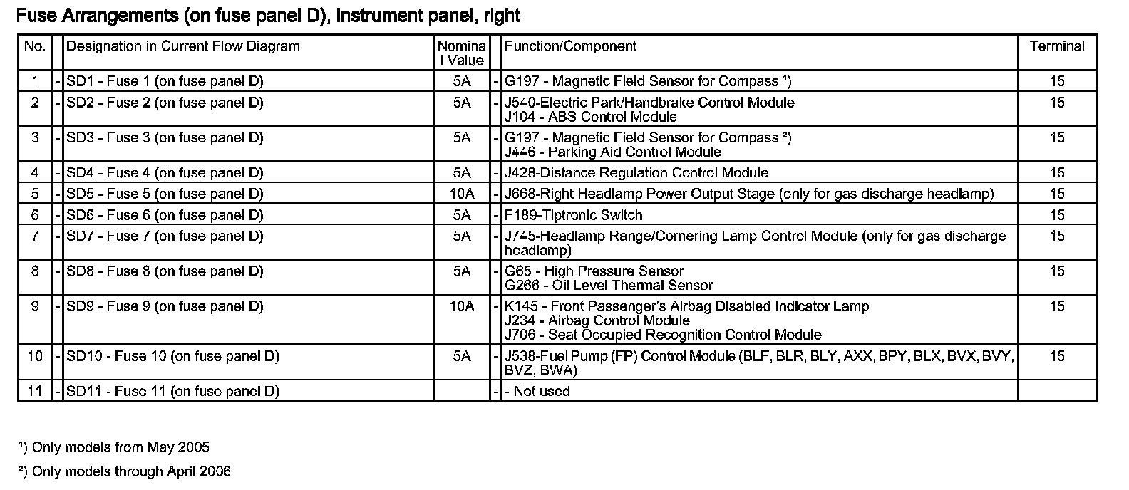 Fuses (SD) (On Fuse Panel D), Instrument Panel, Right: