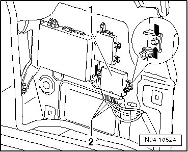 - On both sides of Parking Aid Control Module depress locking tabs - arrows - and pull Parking Aid Control Module - 1 - out of retainers.
