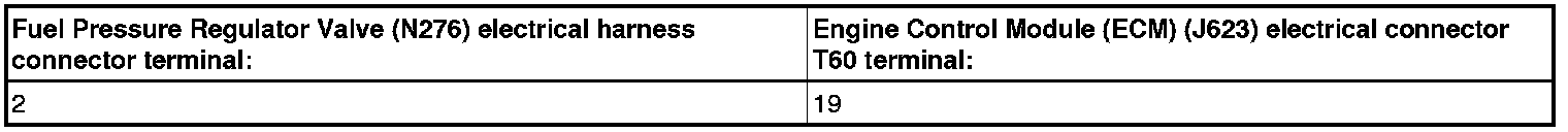 - Using a multimeter, check the Fuel Pressure Regulator Valve (N276) electrical harness connector terminals to the Engine Control Module (ECM) (J623) electrical harness connector terminals for an open circuit according to the chart below.