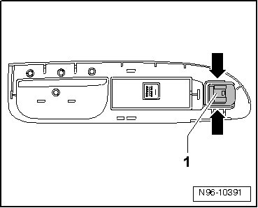 - Disengage retaining tabs - arrows - and remove Mirror Adjustment Switch - 1 - from grip panel.