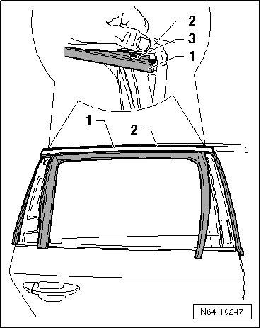 - Press trim molding - 1 - by hand evenly - arrow - into window guide - 2 -.