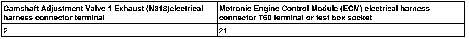 - Using a, Check the Camshaft Adjustment Valve 1 Intake (N205) or Camshaft Adjustment Valve 1 Exhaust (N318) electrical harness connector terminal 2 to the Motronic Engine Control Module (ECM) electrical harness connector for an open circuit.