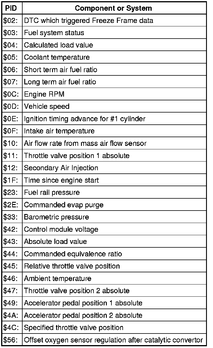 • Depending on scan tool and protocol used, the information in diagnostic mode 02 may be referred to by different names such as Test-ID (TID), Hex-ID, Component-ID (CID), or On-Board Diagnostic Monitor Identifier (OBDMID).