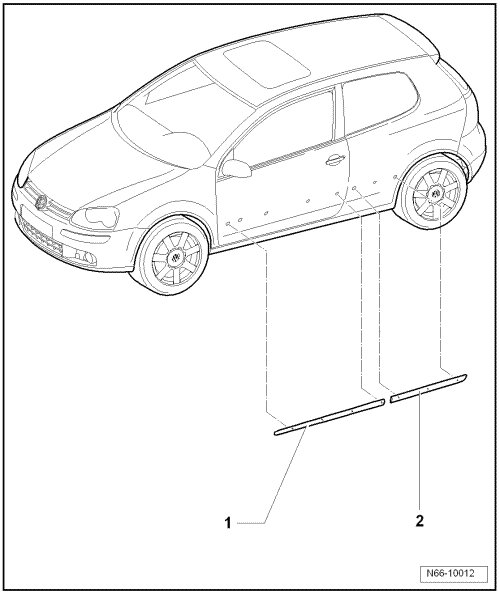 - Before removing, heat side protective moldings - 1 - and - 2 - using a hot air gun (V.A.G 1416) and remove side protective moldings.
