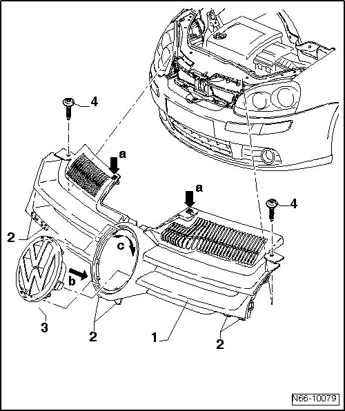 Installing: Guide manufacturer's emblem with catch into recesses in radiator grille - arrow b -, then twist slightly in direction - arrow c - until manufacturer's emblem engages in radiator grille.