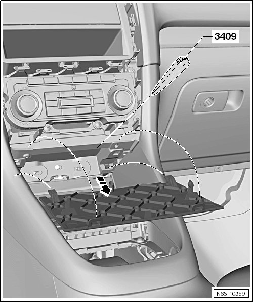 - Remove the trim in the center of the instrument panel (Rabbit from MY 2009). Refer to => [ Instrument Panel Center Trim, Rabbit from MY 2009 ] Instrument Panel Center Trim, Rabbit From My 2009