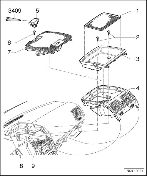 Instrument panel center vent (vehicles with Climatronic), removing. Refer to => [ Instrument Panel Center Vents, Vehicles with Climatronic, Rabbit from MY 2004 ] Instrument Panel Center Vents, Vehicles With Climatronic, Rabbit From My 2004